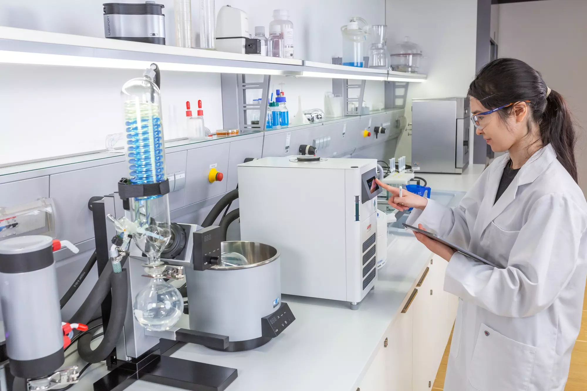 Rotationsverdampfer sind in Laboratorien wichtige Instrumente zur Abtrennung von Lösungsmitteln und zur Anreicherung wärmeempfindlicher Substanzen. Die Verdampfung erfolgt bei niedrigeren Temperaturen als es bei einem klassischen Destillationsverfahren der Fall ist, dafür unter Vakuum in einem rotierenden Kolben. Diese Vorgehensweise ermöglicht eine substanzschonende, kontrollierte, energieeffiziente und reproduzierbare Destillation.