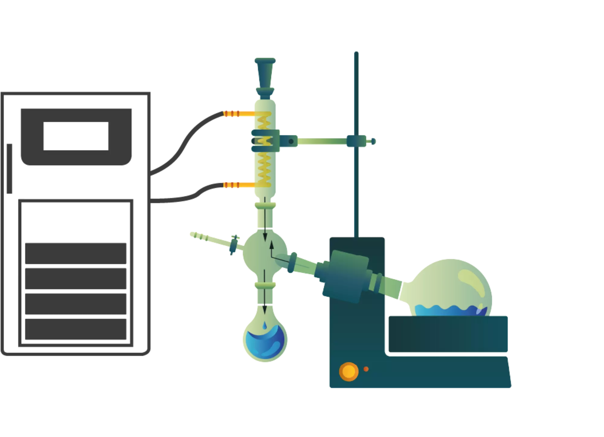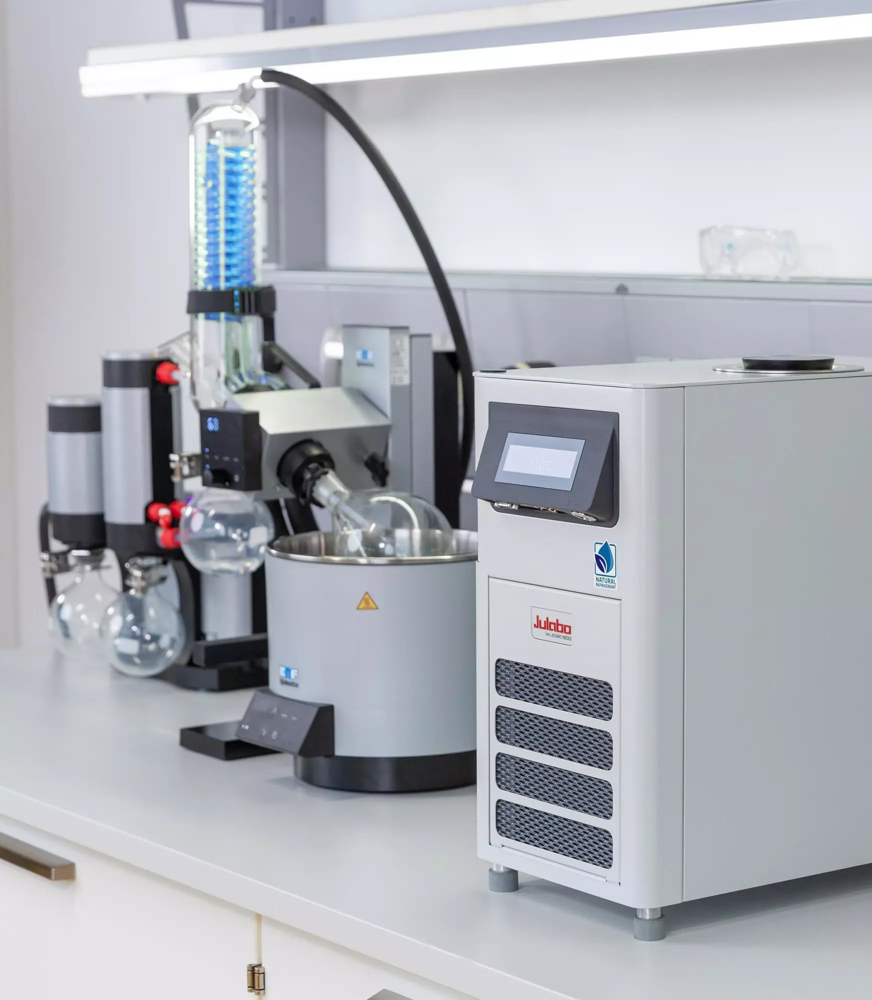 Rotationsverdampfer sind aus dieser Perspektive betrachtet, keine Einzelgeräte , sondern integrierte Systeme innerhalb der Laborumgebung. Der Destillationsprozess stellt sich als ein geschlossener energetische Kreislauf dar: Das Heizbad bringt die erforderliche Energie ein, der Kühler führt sie kontrolliert wieder ab. Nur wenn Heiz- und Kühlleistung exakt aufeinander abgestimmt sind, verläuft die Verdampfung effizient. Eine präzise Temperaturregelung im Zehntelgradbereich ist folgerichtig nicht allein eine wünschenswerte Option, sondern die Voraussetzung für Prozessstabilität, Energieeffizienz und Produktsicherheit.